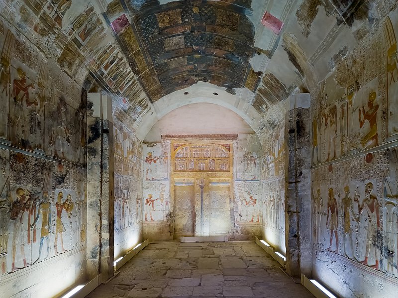 Each chapel is roofed over with corbeling slabs cut as flat vaults, which were decorated with stars and the royal cartouches. Six of the chambers had double false doors on their rear walls, that of Osiris had a real door that gave way to a suite of rooms, dedicated to him, just behind the seven chapels.