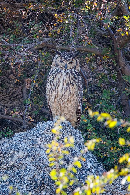 The Indian eagle-owl (Bubo bengalensis), also known as the Bengal eagle-owl or rock eagle-owl, is a large horned owl species native to hilly and rocky scrub forests in the Indian subcontinent. They are apex predators, feeding on rodents, birds, and reptiles, effectively maintaining ecological balance.