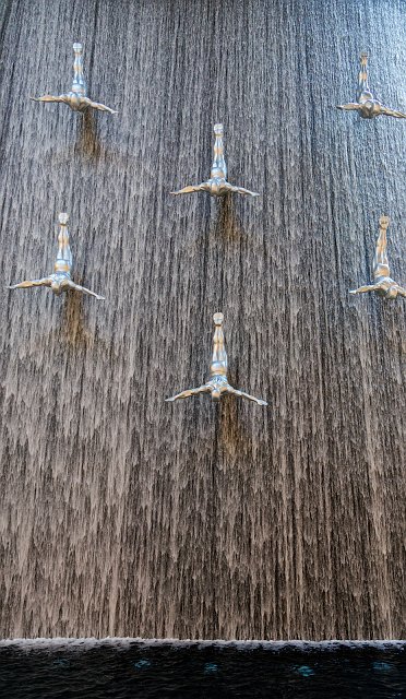 The waterfall in Dubai Mall is 24 meters tall and has a circular shape; its diameter is over 30 meters. It is usually referred to as the Human Waterfall in Dubai Mall, due to the sculptures of men diving in. The falling of the water is designed to create a visual illusion, making it seem that the divers are moving instead of the water. The figures are sculpted in fiberglass and represent pearl divers jumping into the water. Pearl diving was the main source of livelihood in the UAE, and the basis for the founding of Dubai and Abu Dhabi.